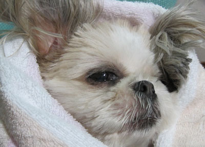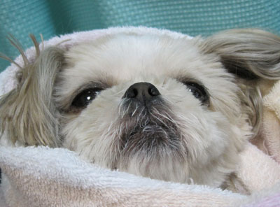 寒そうなルーシーをタオルで包んで抱っこして数分後、眠気に目がトロンとしてきました。