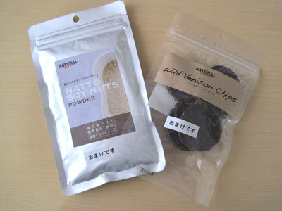 今回は1袋多く注文したからか、おまけも増えていました♪右が「鹿肉のチップス」、左が「納豆パウダー」です。鹿肉は何度か頂いていますが、意外と柔らかくて細かく手で千切れる程なんです。とても美味しい様でミルキー達も大喜びしますww