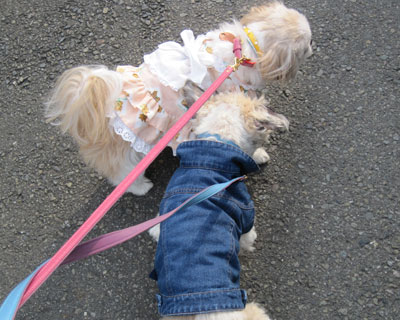 大概、歩きたくない時や飽きた時です。↑のルーシーは砂利の上を歩きたくなくて抱っこをせがんでいます。
