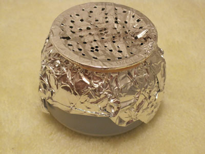 ヨーグルトの空き容器にアルミ箔を被せ、爪楊枝で小さな穴を開けてあります。