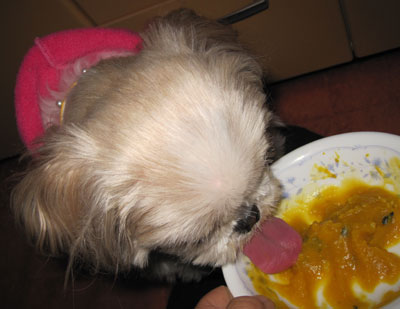 昼過ぎまで休養して、スポーツドリンクと水を半々で割って水分を摂らせました。この後に吐いたら再び断食です。三時間経っても吐かなかったので、カボチャとサツマイモを潰してお湯を加えたペースト状の離乳食モドキを与えたら大喜びで完食しました。(↑画像)昨夜のおかずの煮物が残っていて良かった~。もしも吐く原因がフードだったのなら、なるべくフード以外で嗜好性の高い食べ物が望ましかったのです。