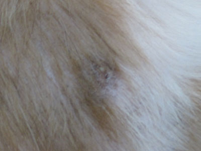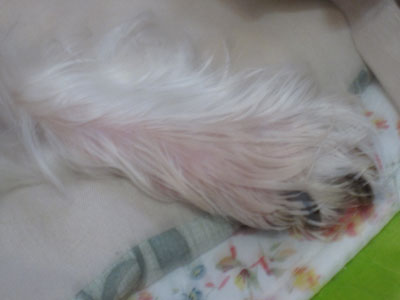 腕の関節辺りから指先までを毎日何回も舐め続けて、とうとう白い毛が赤く焼けてきました。
