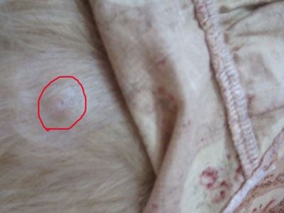 背中にあるこの別の脂肪腫は、最初から出口の穴が開いていて定期的に絞って中身を出しています。