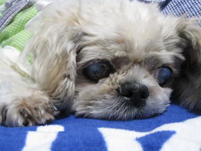 ルーシーの右目の白内障が一気に進みました。かなり白く濁って見えます。ごく偶に物にぶつかる事があり、視界に影響が出ているようです。