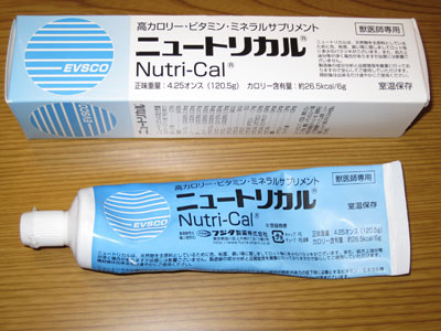 ミルキーは午前中はあまり食欲が無いみたいで、数口しか食べてくれない時があります。そんな時にこの「ニュートリカル」が大活躍。以前のブログにも書きましたが、嗜好性の高い高カロリー食です。冷蔵庫で冷やすとゼリー状に固くなって食べさせ易くなります。フードは食べなくてもコレは喜んで口に運びます。偏食する子の体重管理にオススメします。コレのお陰でミルキーも体重を減らさせずに済みます。獣医師専用って書いてありますけど、ネットで買えますよ。¥1,000-ちょっとだったような?意外に安い。