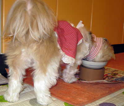ミルキーのご飯のお零れに与る、食いしん坊なルーシー。