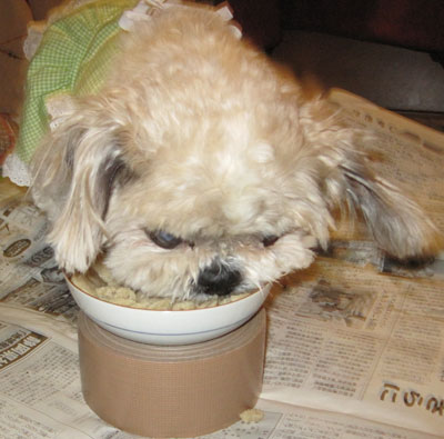 布テープで食器の高さを嵩上げしてから食べ易くなったのか、食事の途中からお座りの姿勢で食べています。お座りの方が体が楽なんでしょうね、なんか怠惰だなぁ~(苦笑)