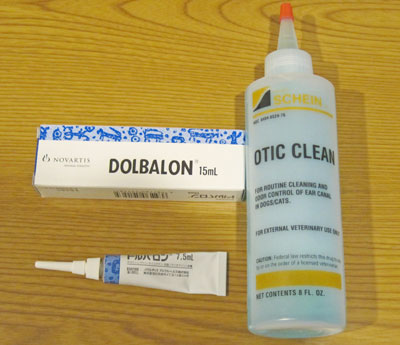 外耳炎の治療には上の「ドルバロン」をたっぷりと耳奥に流し込んで、よく耳を揉んでおきます。塗薬の前には、洗浄液で耳垢が出なくなるまで何度も丁寧に洗います。